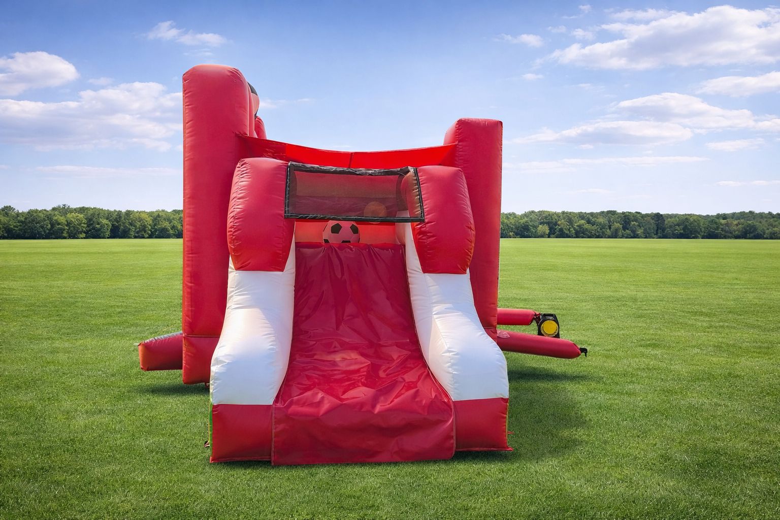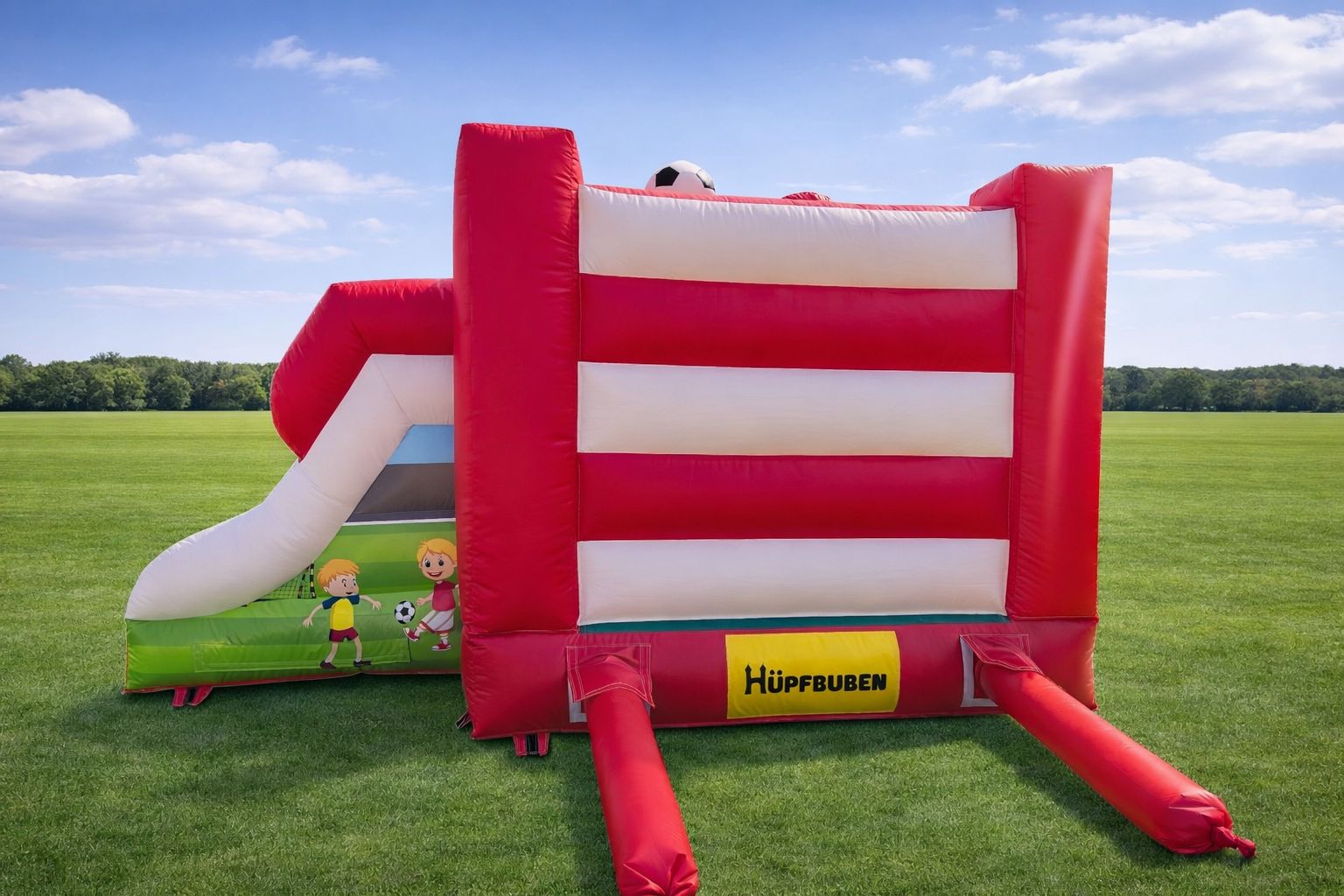 Entdecke unsere Fußball Hüpfburg in Rot-Weiß, der perfekte Hingucker für jede Party! Mit einem Gewicht von circa 60kg und einer Größe von 3 x 4 Metern bietet sie ausreichend Platz für bis zu 4 Personen und sorgt garantiert für jede Menge Hüpfspaß.