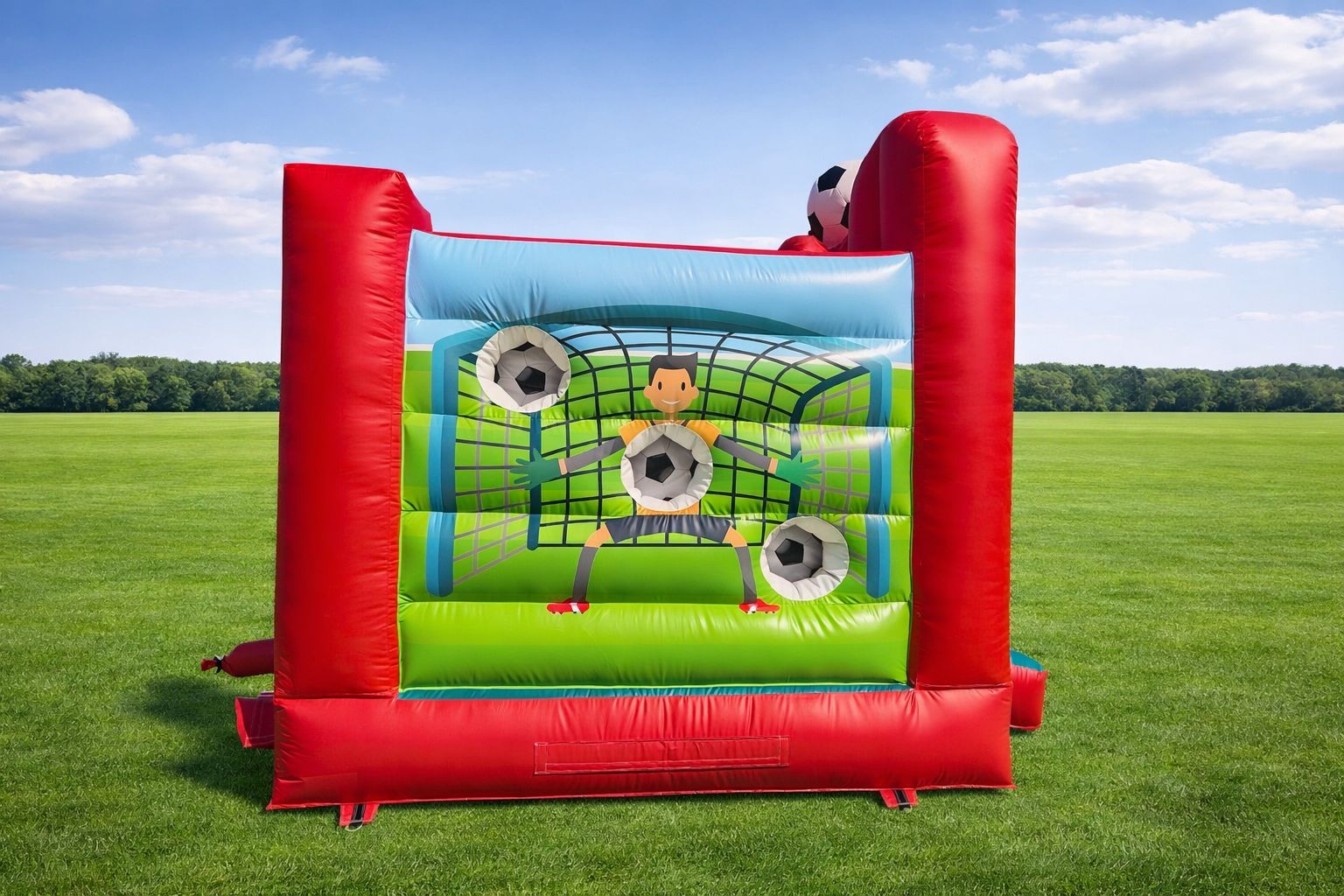 Das besondere Highlight: Außen befindet sich eine integrierte Torwand, sodass auch neben der Hüpfburg jede Menge Spaß garantiert ist – perfekt für alle, die mitspielen wollen!